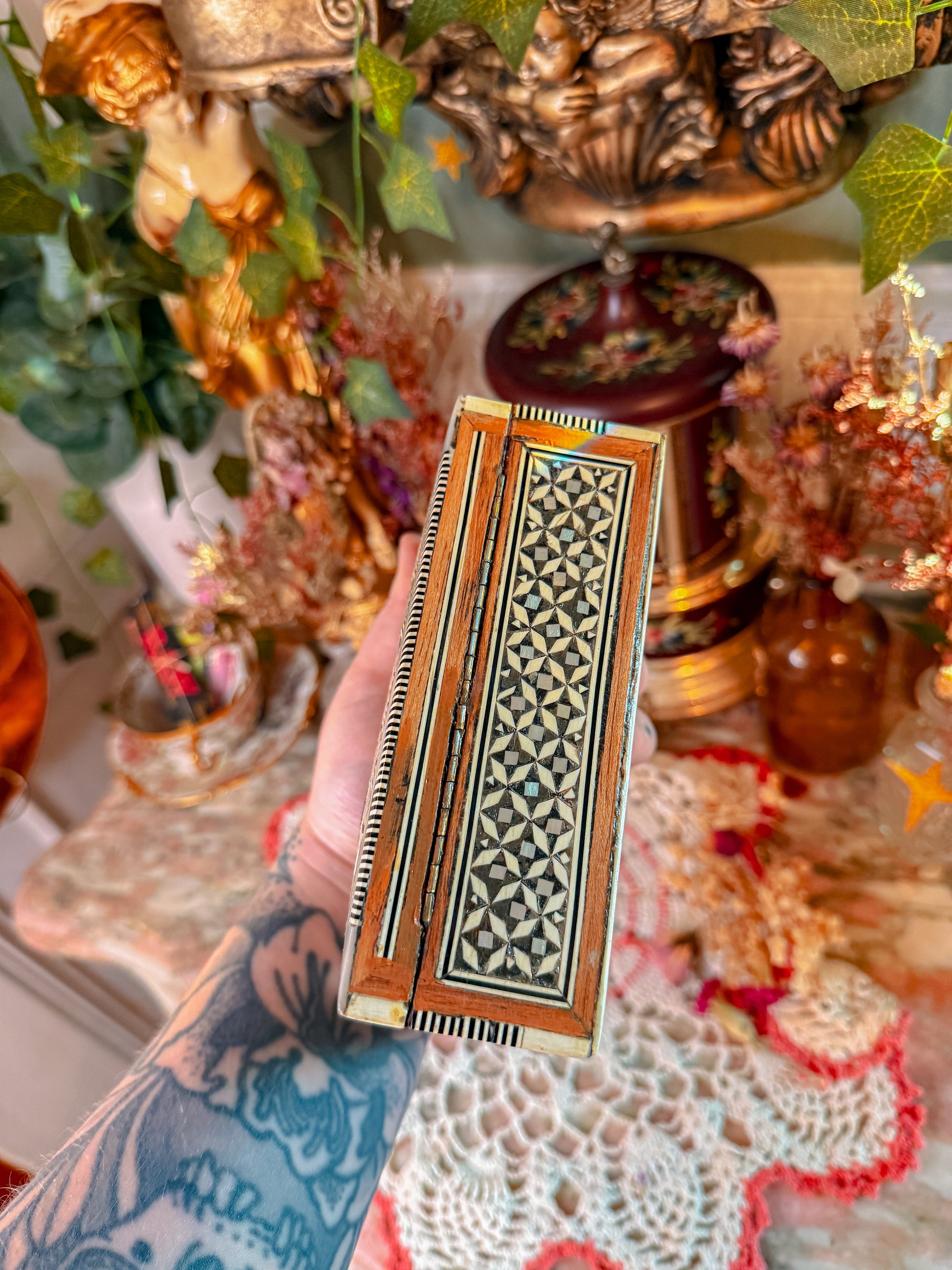 Are yall seeing what I’m seeing? Because wow this is one of the most beautiful stash boxes I’ve ever seen! She’s covered in abalone shell. So she is so shiny and reflects rainbow like colors. I should’ve posted a video because when you move this piece around it’s so striking! Also solid wood. And velvet lined interior. Just gorgeous! (These also go for $$$)