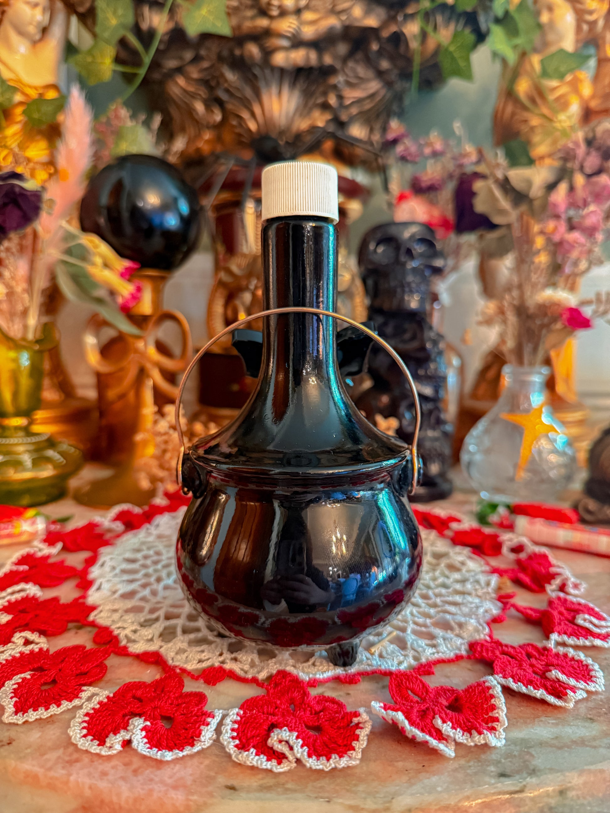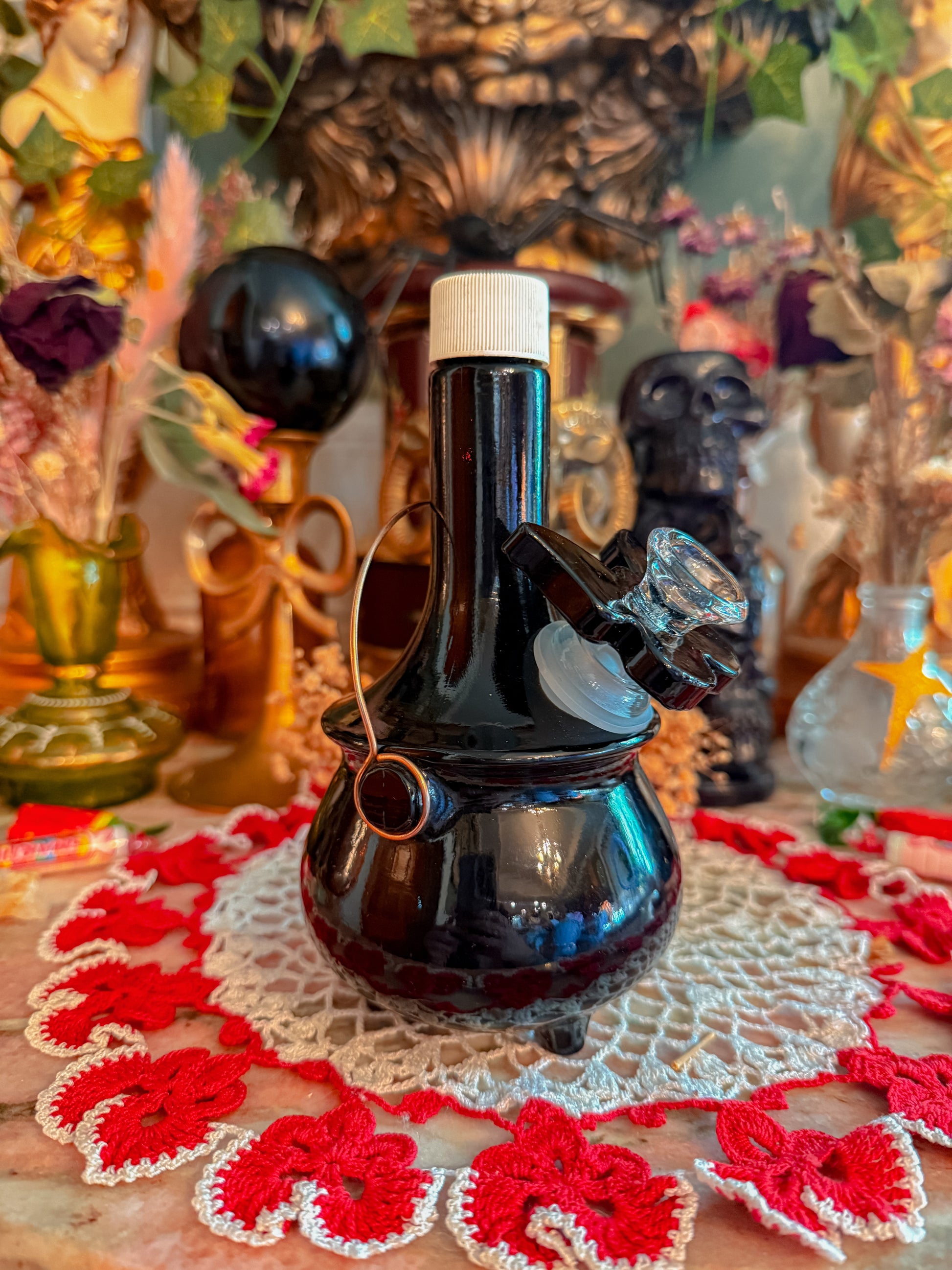 What a darling piece! She’s a cauldron 😭 the handle too? This piece is just so unique and so dang cool! Very solid black glass. White cap comes off and you hit from there. She preforms so well too. Just a gem!