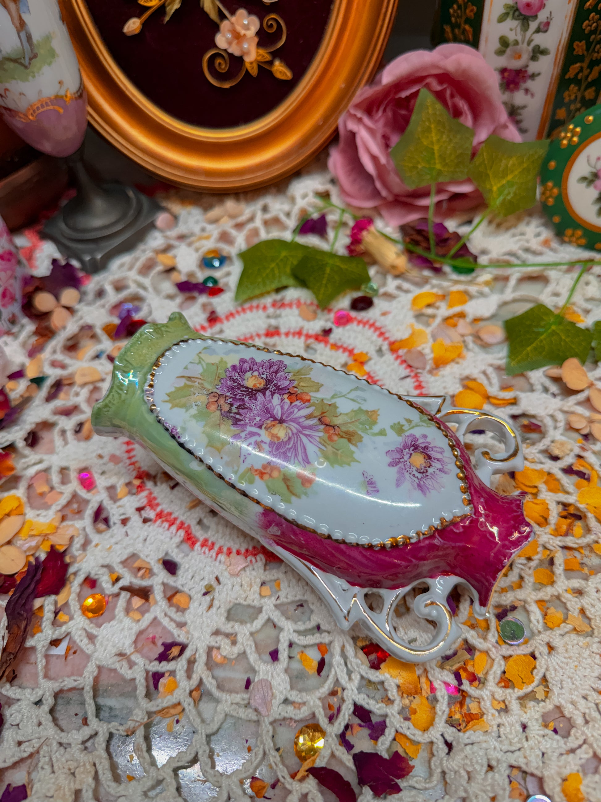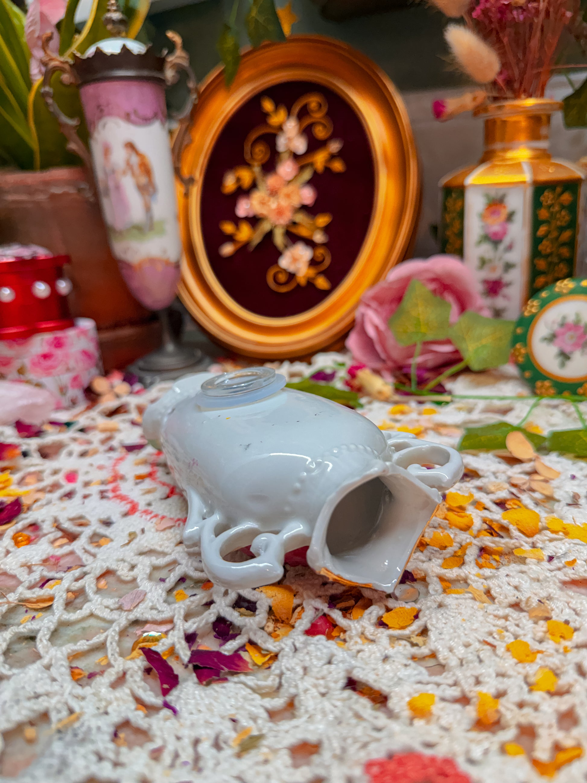 Beautiful German floral pipe made in the late 1800s early 1900s. She’s hand painted. Has 24k gold details and is completely lusterware! Which means she has an iridescent glaze all over her making her even more gorgeous! She hits like a charm and her mouth is super comfy! Just a dream