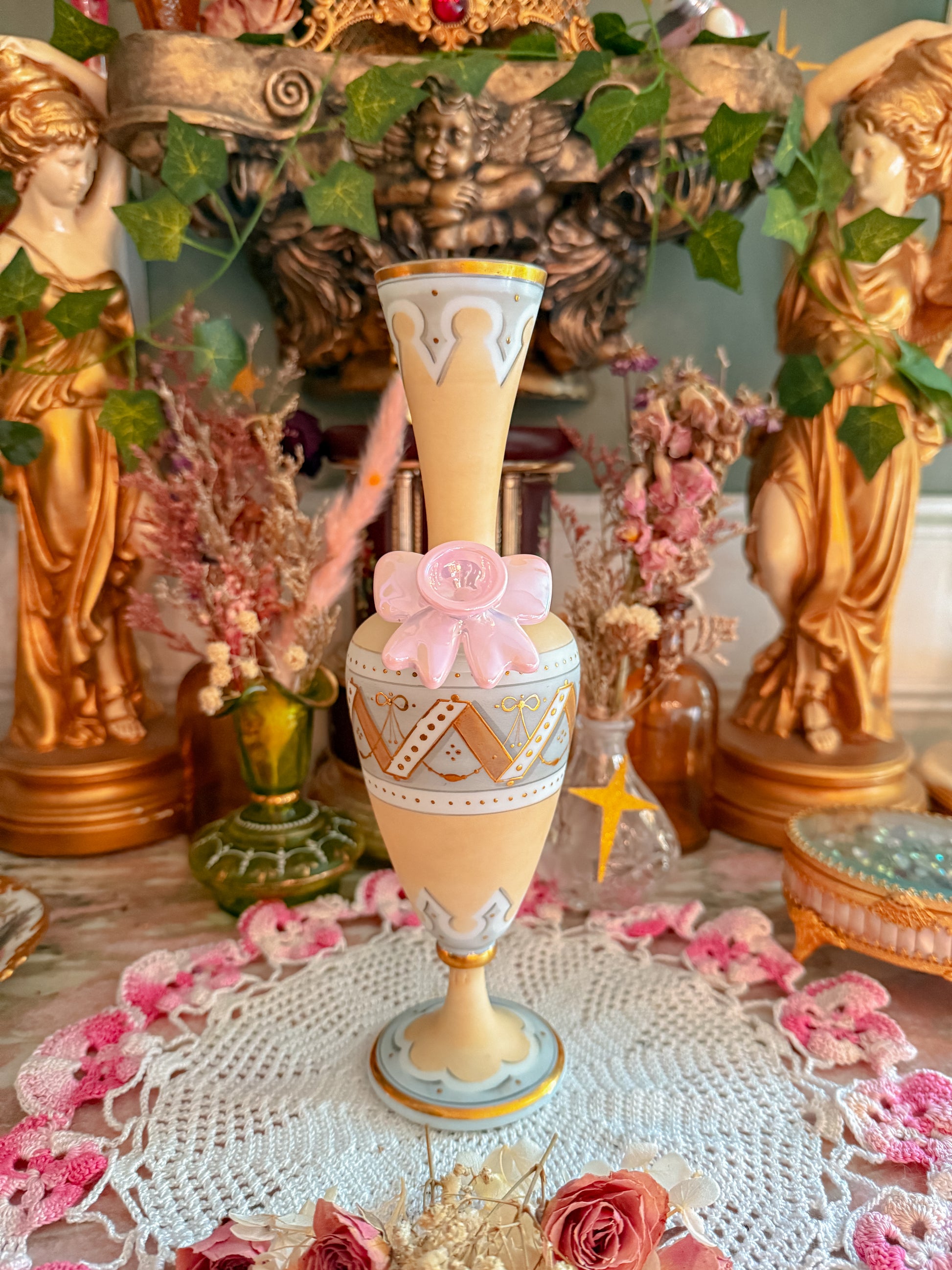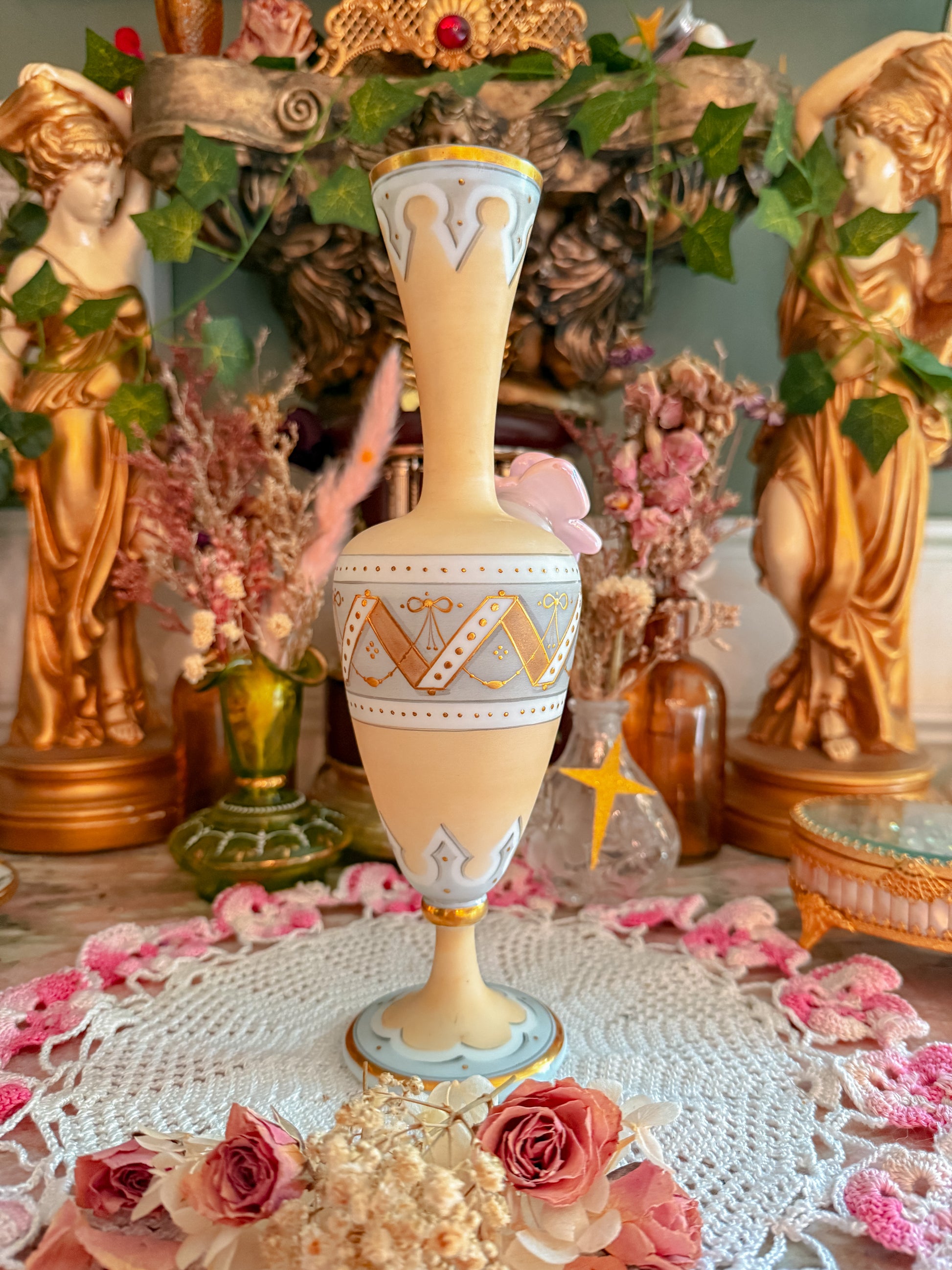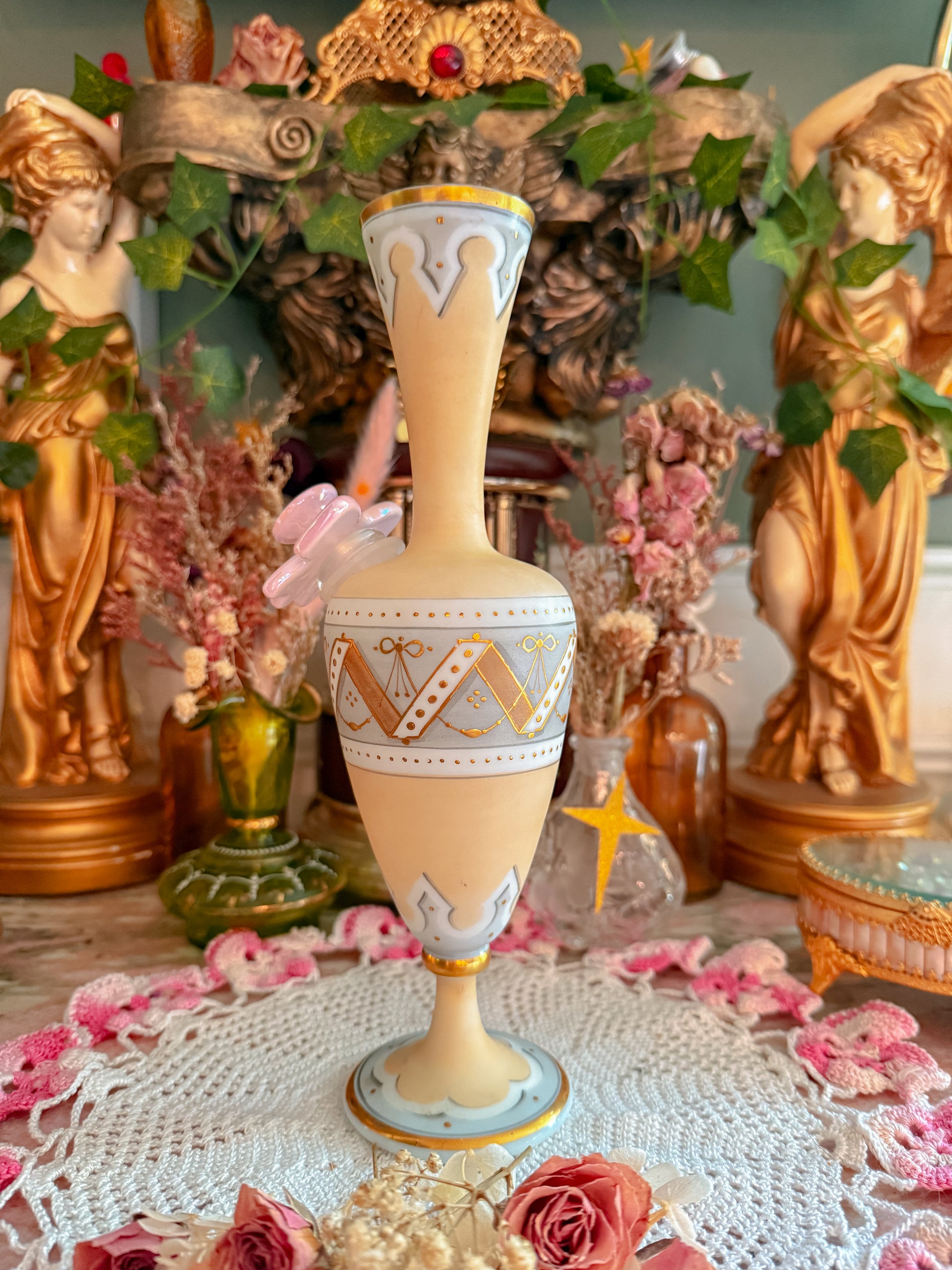 This is a Bristol glass babe. Made in England in the late 1800s. Bristol is one of my favorite types of glass. It’s like opaline. So extremely high quality and durable. It’s butter smooth. Milky and just luxurious! This baby is also hand blown and hand painted/ Has 24k gold and is just so unique! I’ve never had anything like this piece.