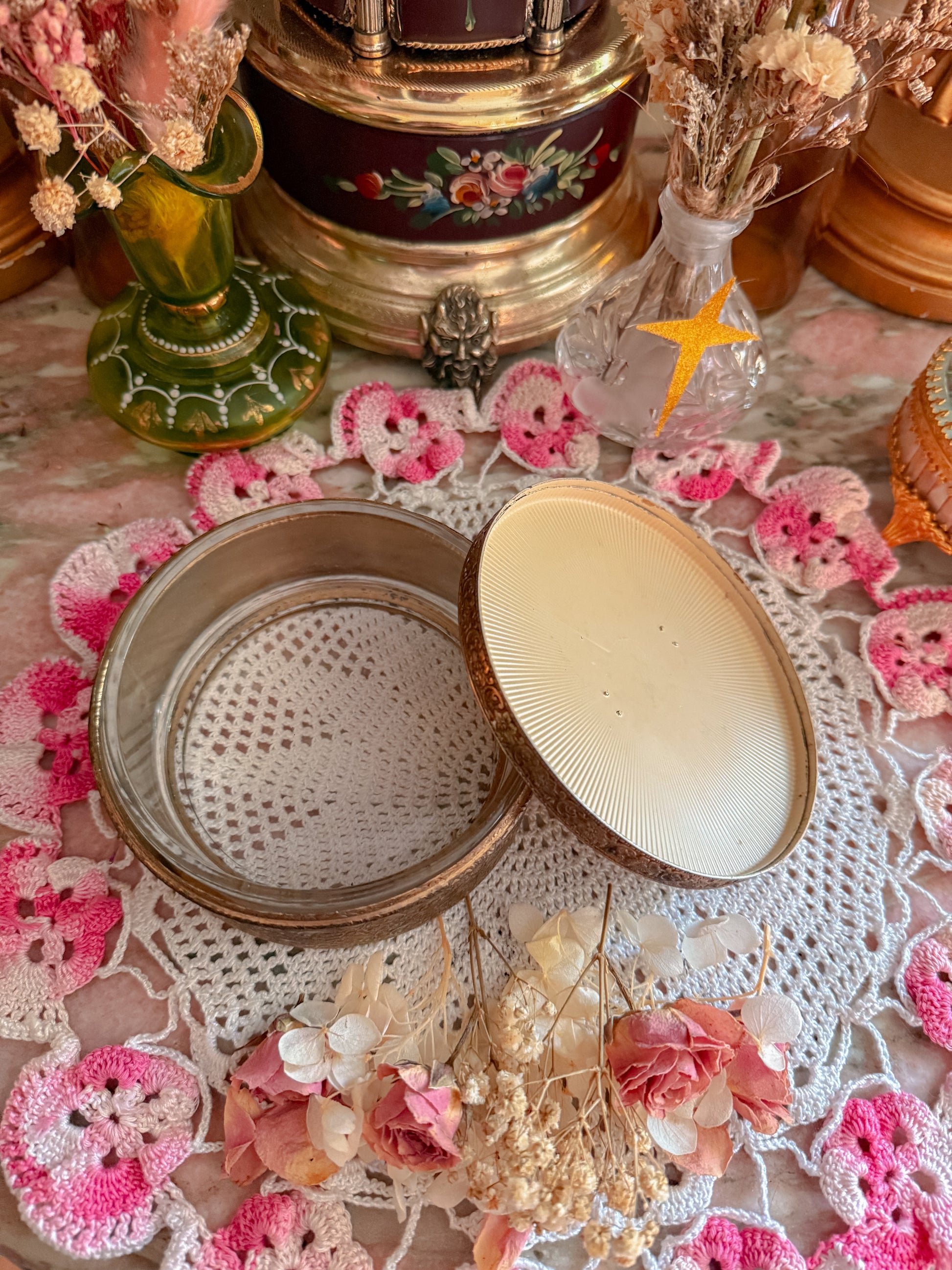 A beautiful Hollywood regency stash jar! This baby is gilted metal and glass. She’s Heavy. Solid. And just stunning! Look at the ornate work on the sides! Just ugh!🥹