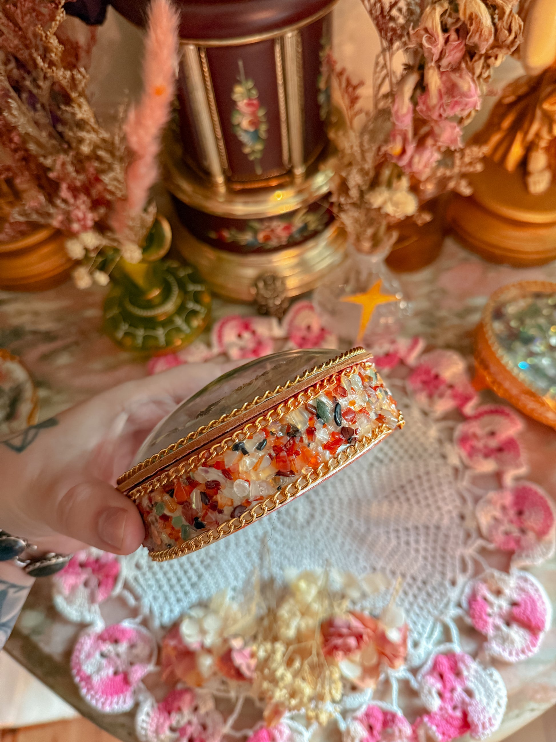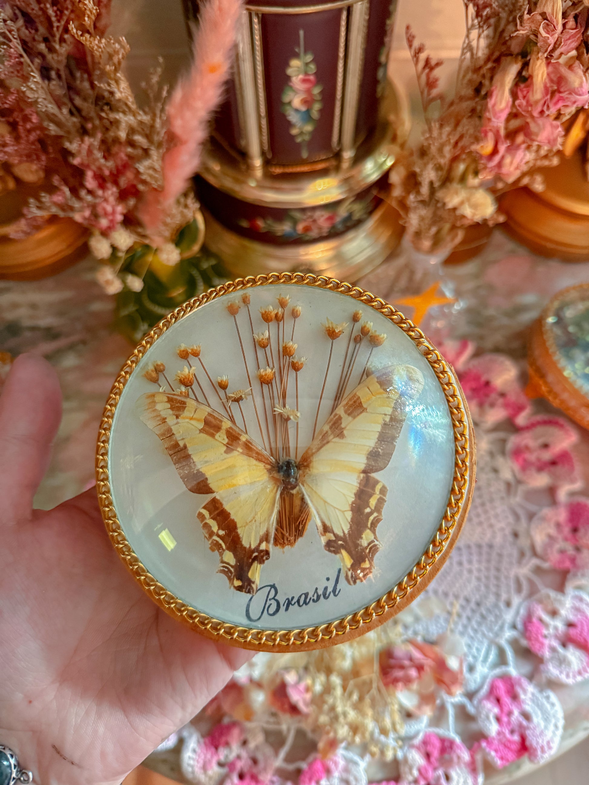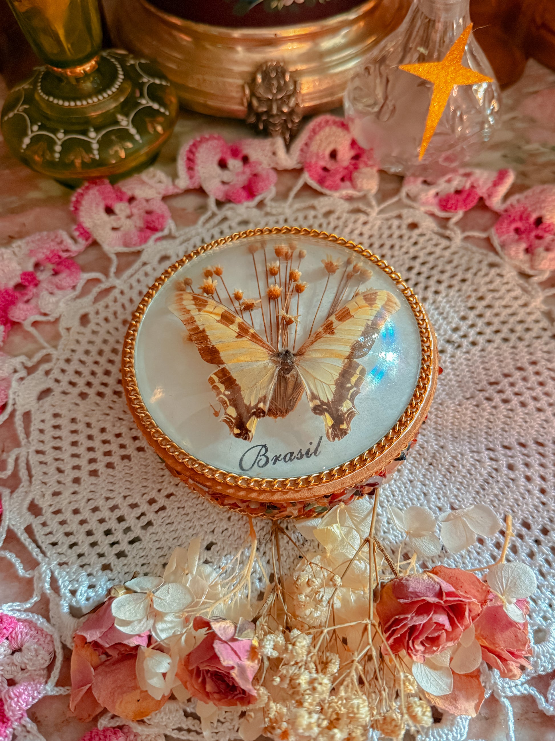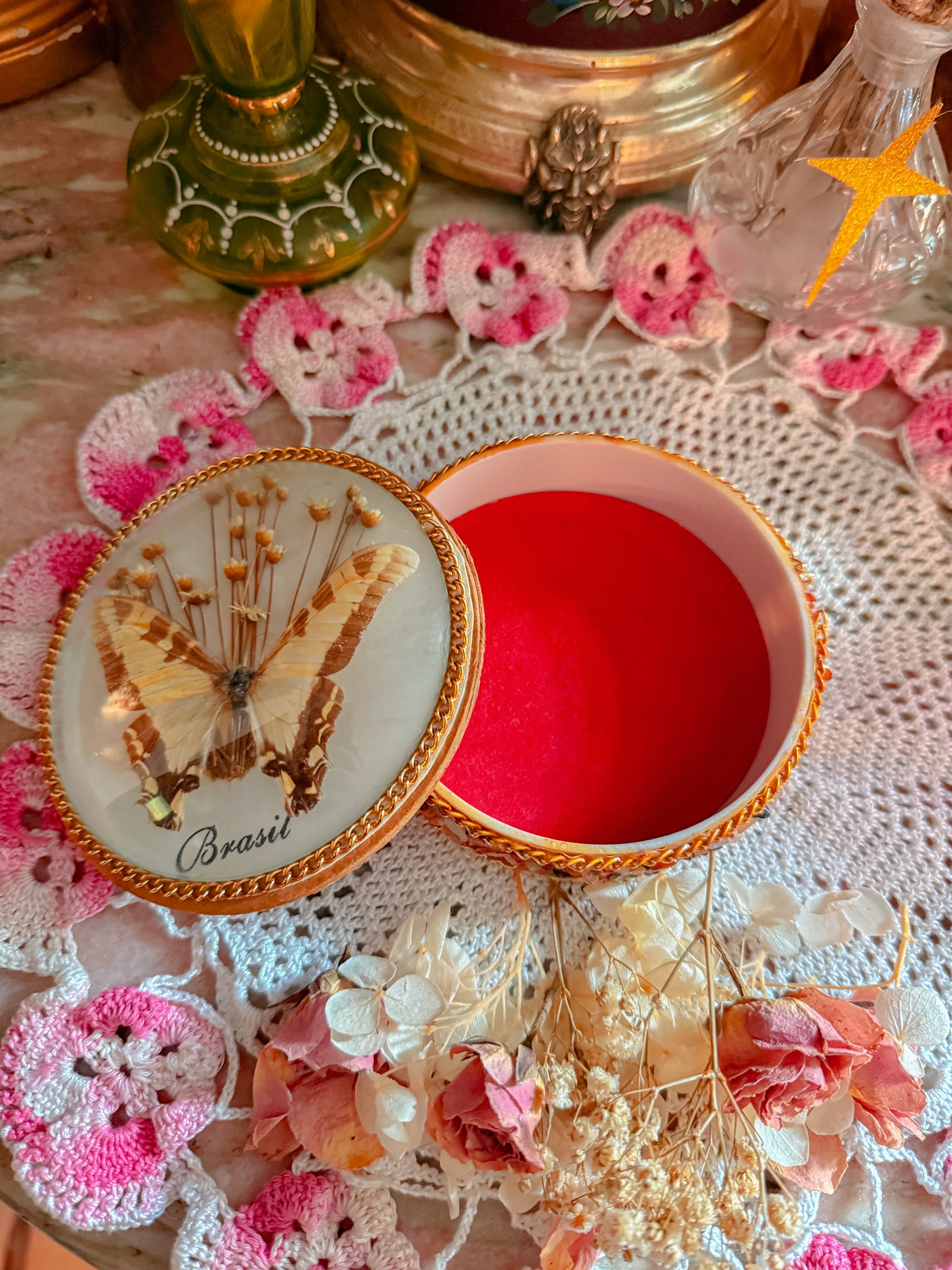 I’m obsessed. This is the prettiest stash jar with a REAL taxidermy butterfly and dried florals. Made in Brazil and Brazil stamped. She has Beautiful stones. Is Gold chain lined. Made of wood. Velvet interior. Just amazing. 🥹