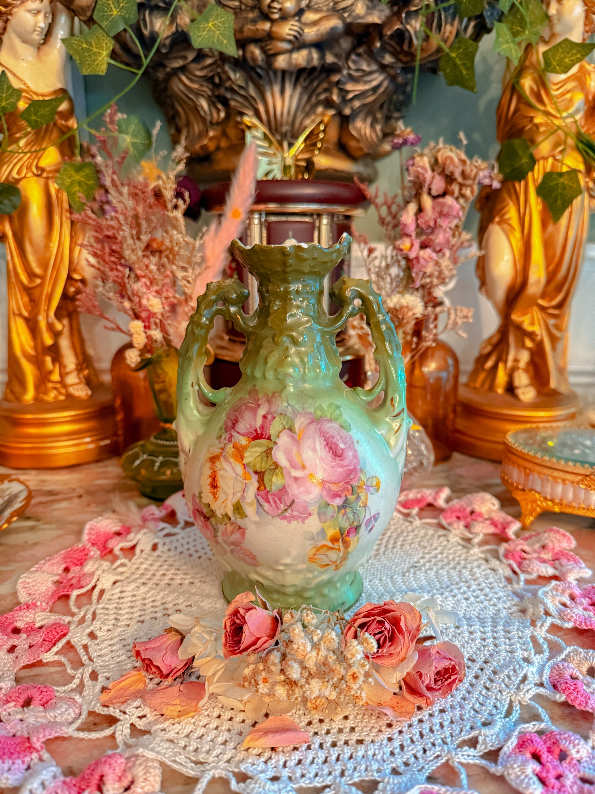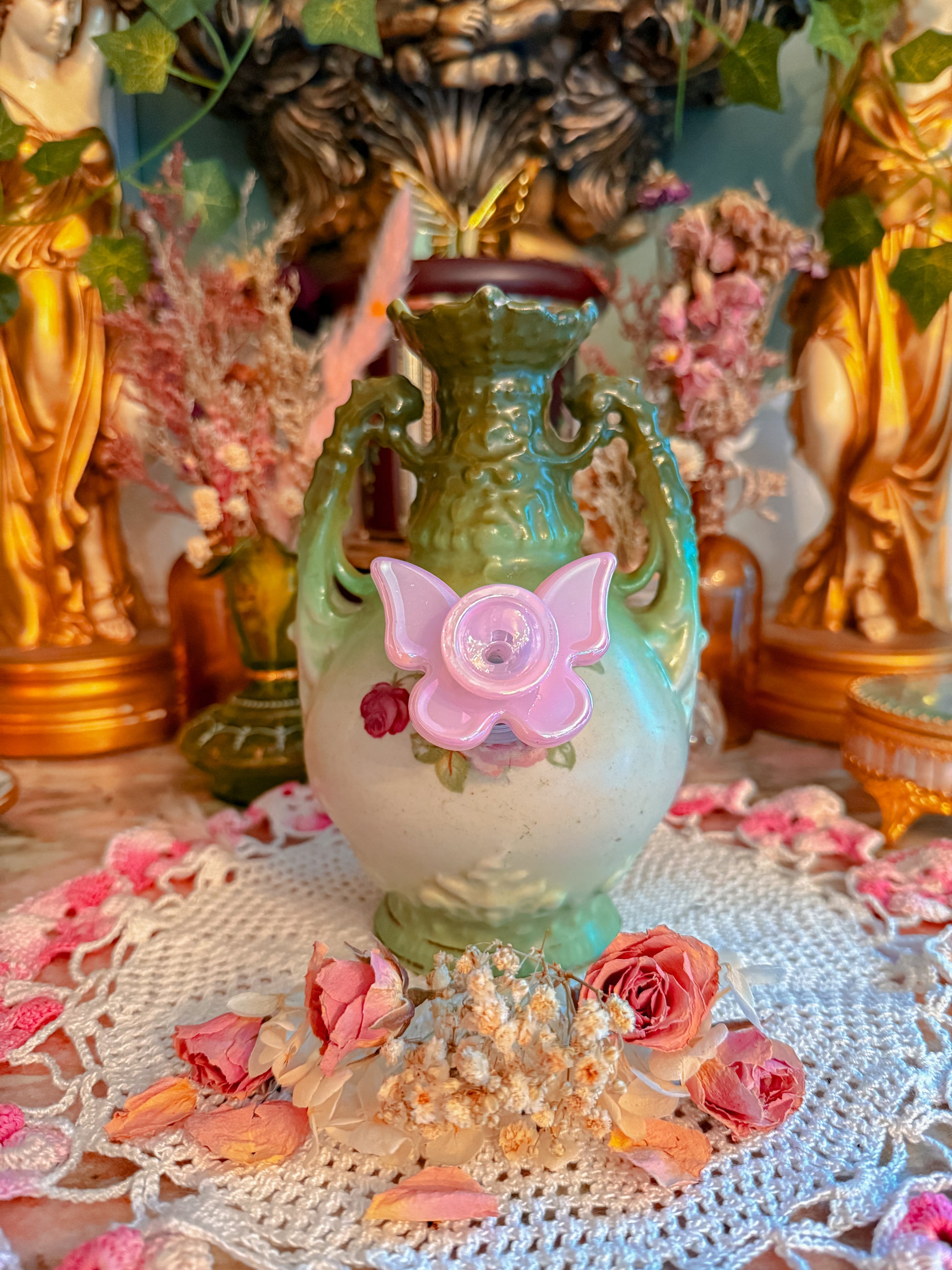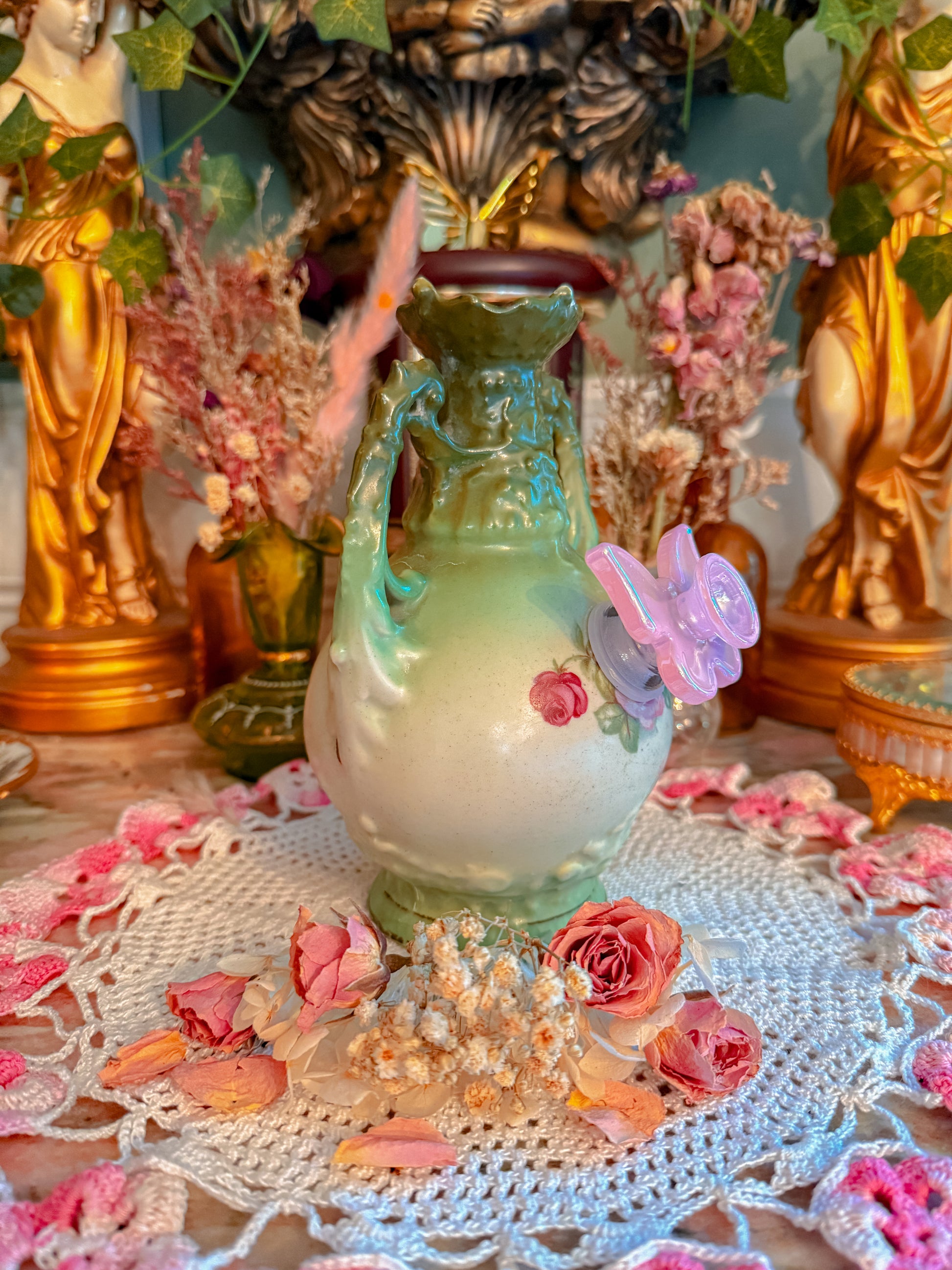 This is a gorgeous Royal Bayreuth piece made in the late 1800s early 1900. Hand painted. Porcelain. 24k gold. I especially love the painterly style of this piece. It’s Truly such a pretty vibe and also the shape and style of her is just so unique. Also a great bongo. Just Such a gem!