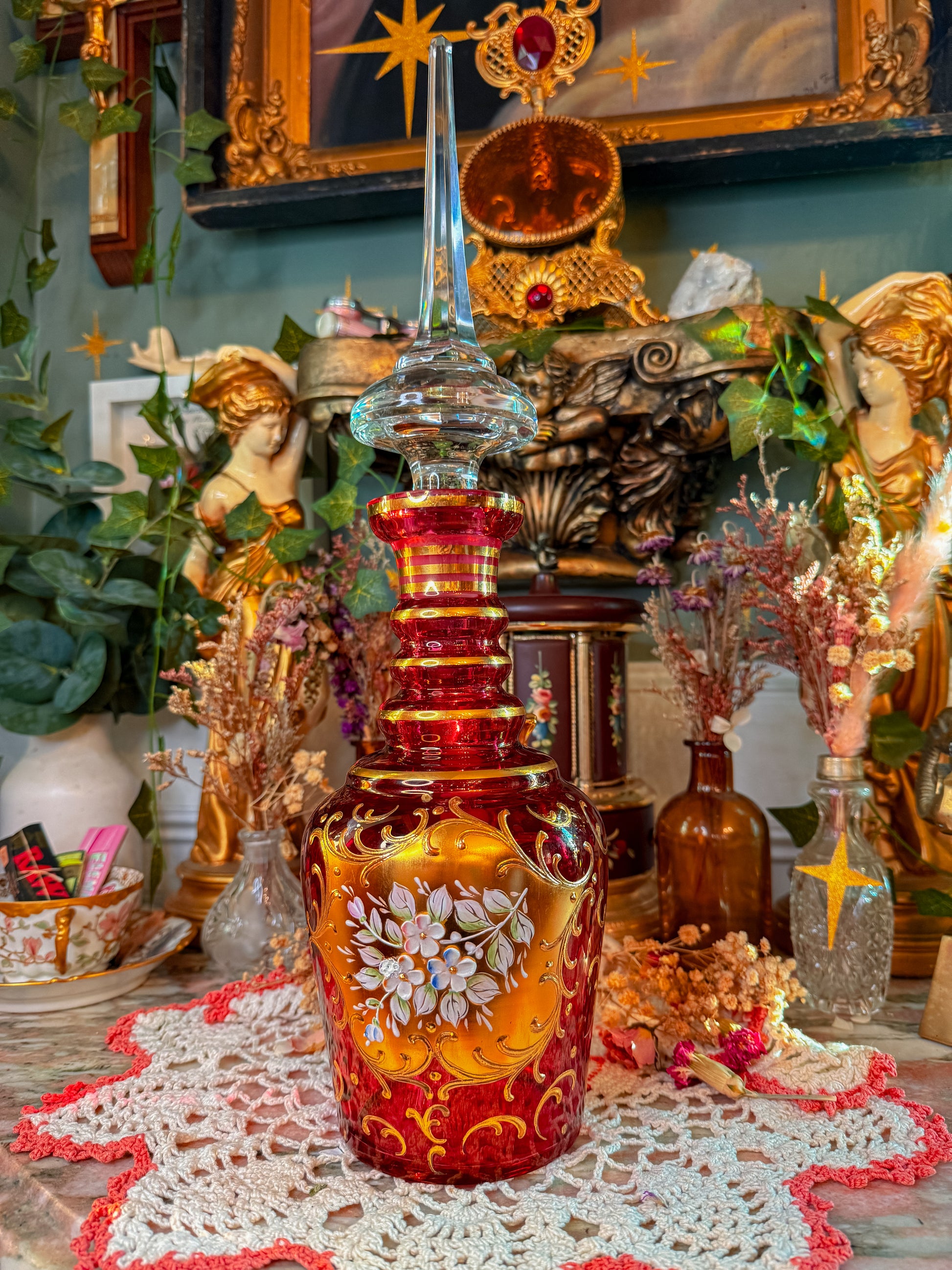 ….bye….. like are you serious? I cannot handle this piece. Not only is this baby SO THICK. She’s SOLID genuine red glass. Also dripping in 24k gold. Hand painted. Made in the late 1800s early 1900s and just a true work of art! She’s also bohemian of course. And a heavy hitter! I seriously can’t get over this one. Pieces like this go for soooooo much money. Also her stopper could totally be a weapon so that’s cool too 😂❤️