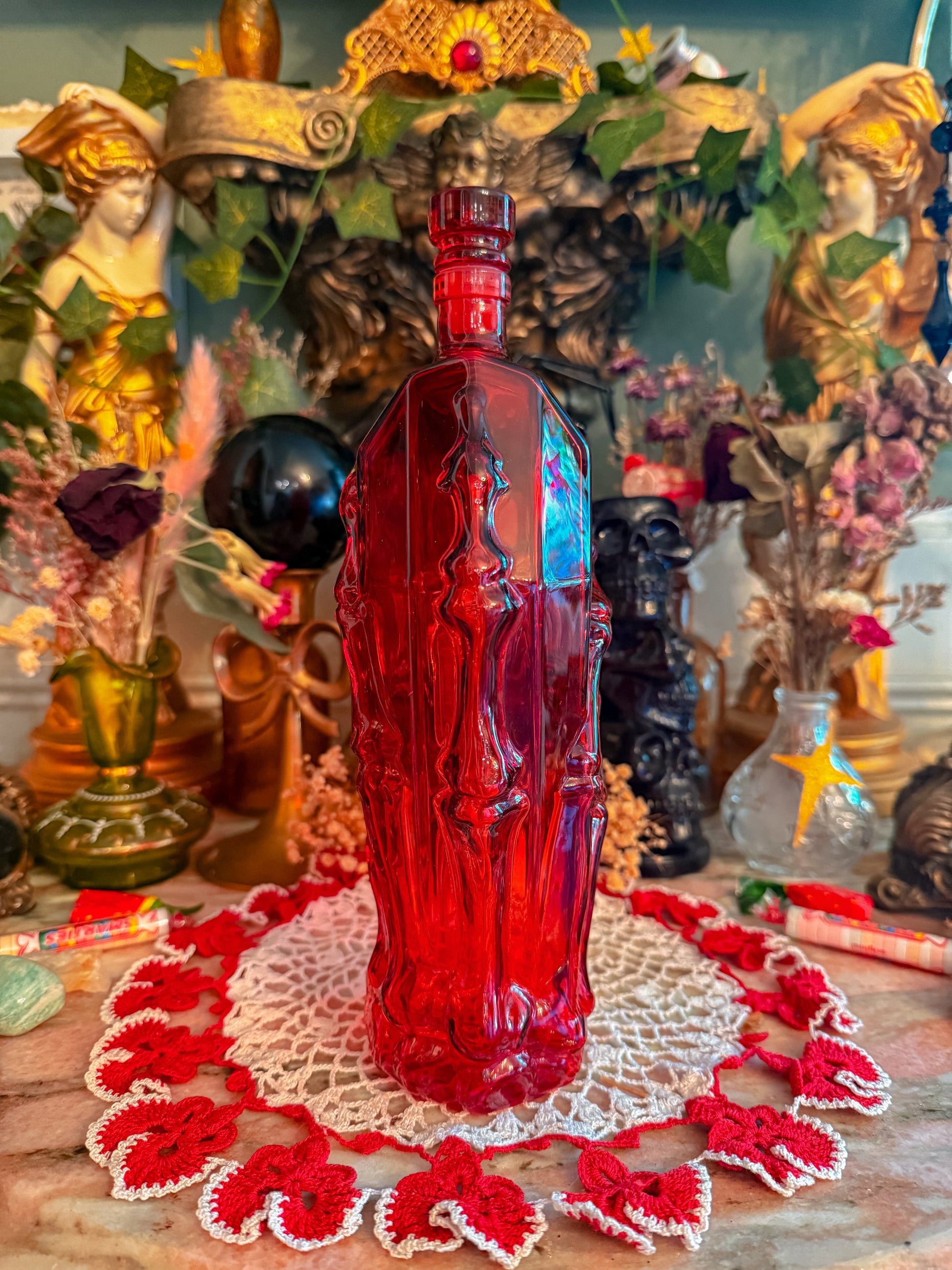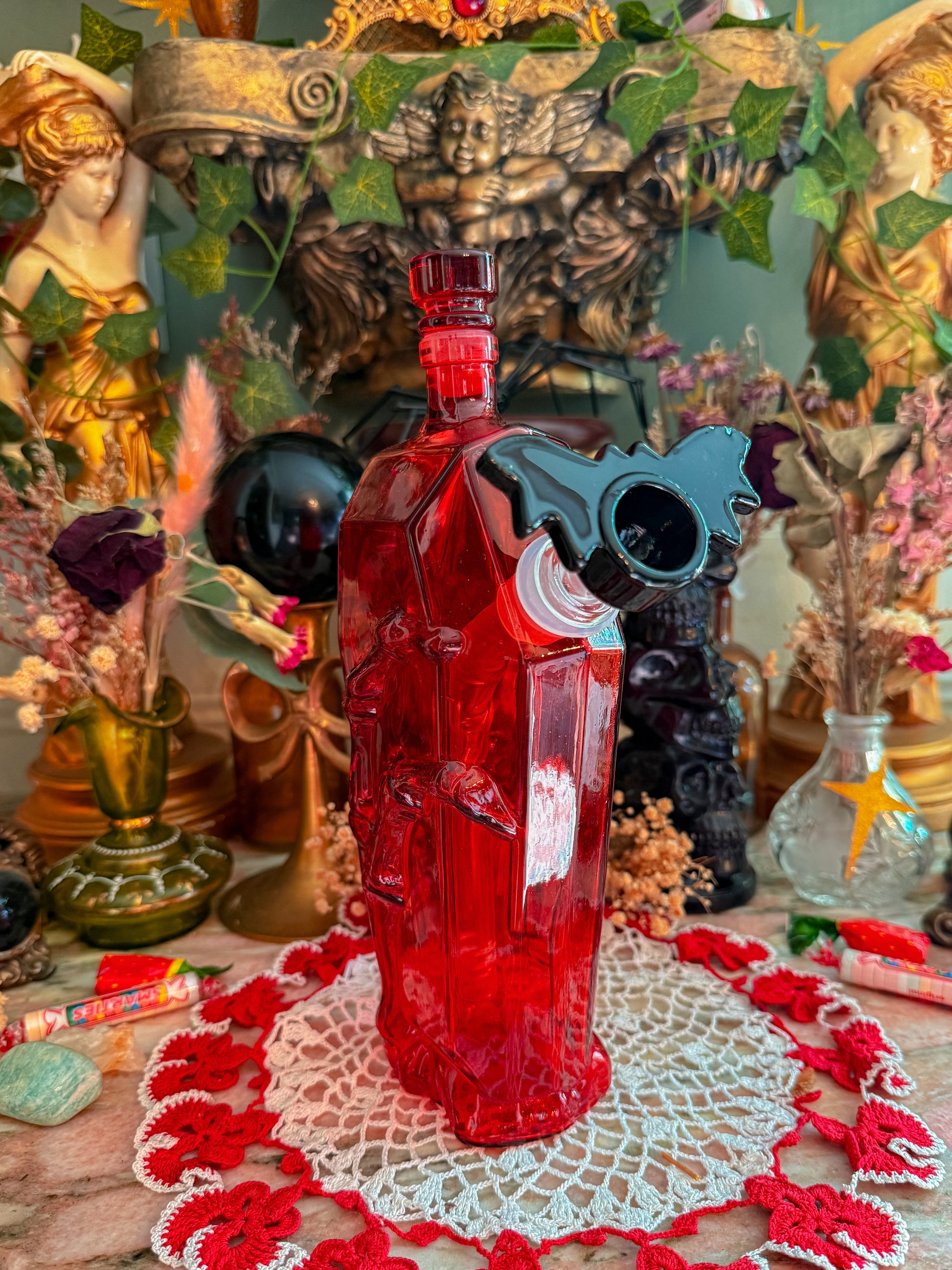 Solid red glass beauty that’s truly to die for! With the skeleton hand?? Come on! Truly such a spooky and unique piece that functions like crazy!
