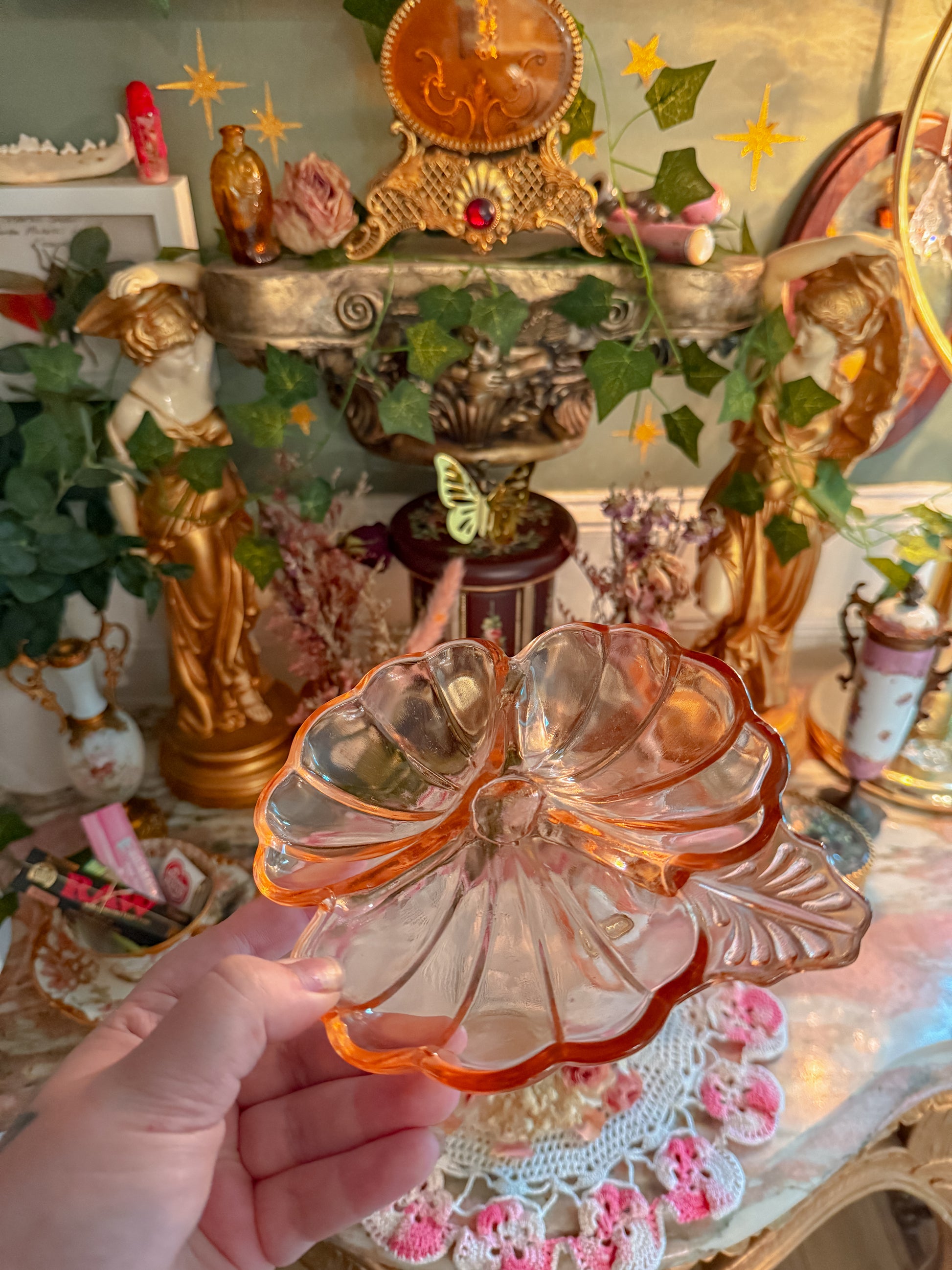 Absolutely stunning set of pink depression pieces from the early 1920s to late 1930s. I have never seen a pink depression piece in this shape before! And when I found the matching flower ashtray I about died! Truly a stunning set and pieces of history.